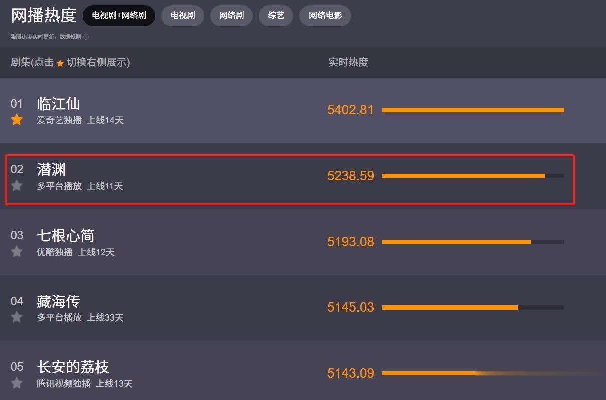 截至发文前,《潜渊》在热度榜稳居榜单第二,仅次于白鹿主演的古偶剧《临江仙》。